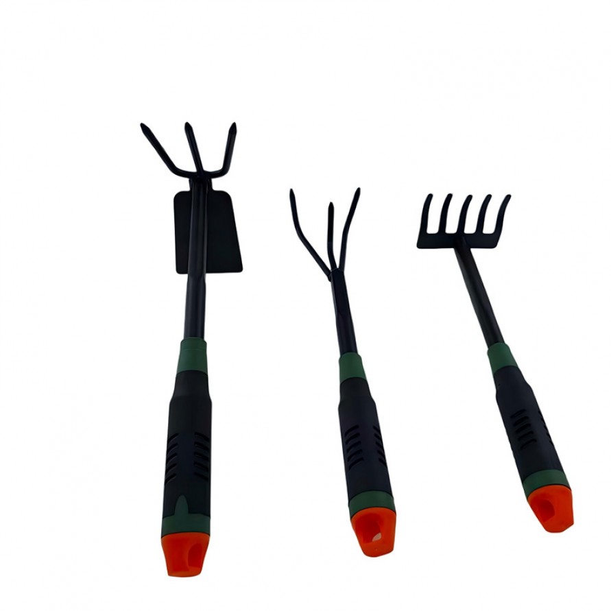 This set of garden hand tools is specifically designed for home gardening and small-scale farming tasks. It includes essential tools such as a hoe, rake, and shovel, capable of handling diverse needs like loosening soil, weeding, turning soil, and planting. Each tool is crafted from premium carbon steel, offering high hardness and wear resistance to ensure long-lasting sharpness and stable performance. The handles are made of high-strength plastic with an ergonomic design, offering a comfortable grip that is slip-resistant and durable for effortless operation. The compact set design facilitates easy storage and portability, making it an ideal choice for home gardens, balcony plants, and agricultural enthusiasts.