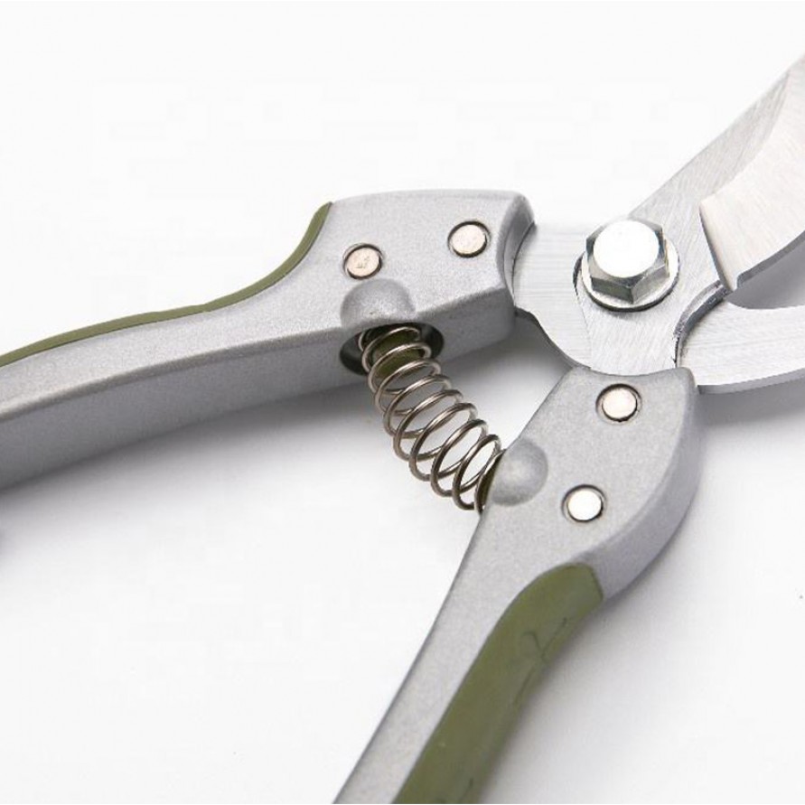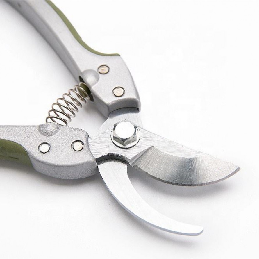 These pruning shears feature high-quality stainless steel blades that are robust, durable, and exceptionally sharp—ideal for trimming flowers, fruit trees, and potted plants. The blades and aluminum connecting components are precision-engineered to ensure smooth, effortless operation even after prolonged use. The ergonomic D-shaped metal handle provides a comfortable grip and minimizes user fatigue, while the moss-green finish adds a touch of natural aesthetic appeal. Weighing approximately 150 grams, the shears are lightweight, portable, and easy to handle, making them the perfect tool for both home gardening enthusiasts and professional landscapers.