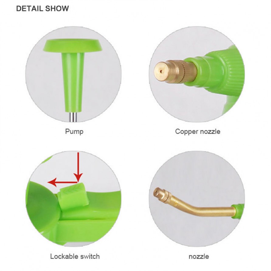 The sprayer body is made of durable plastic with a reliable manual pump mechanism. After use, promptly rinse out any residual liquid to prevent prolonged storage of fertilizer or chemicals, which may cause clogging or corrosion. Store in a dry place to extend the sprayer's lifespan. Regularly inspect the nozzle and pump body to ensure smooth spraying.