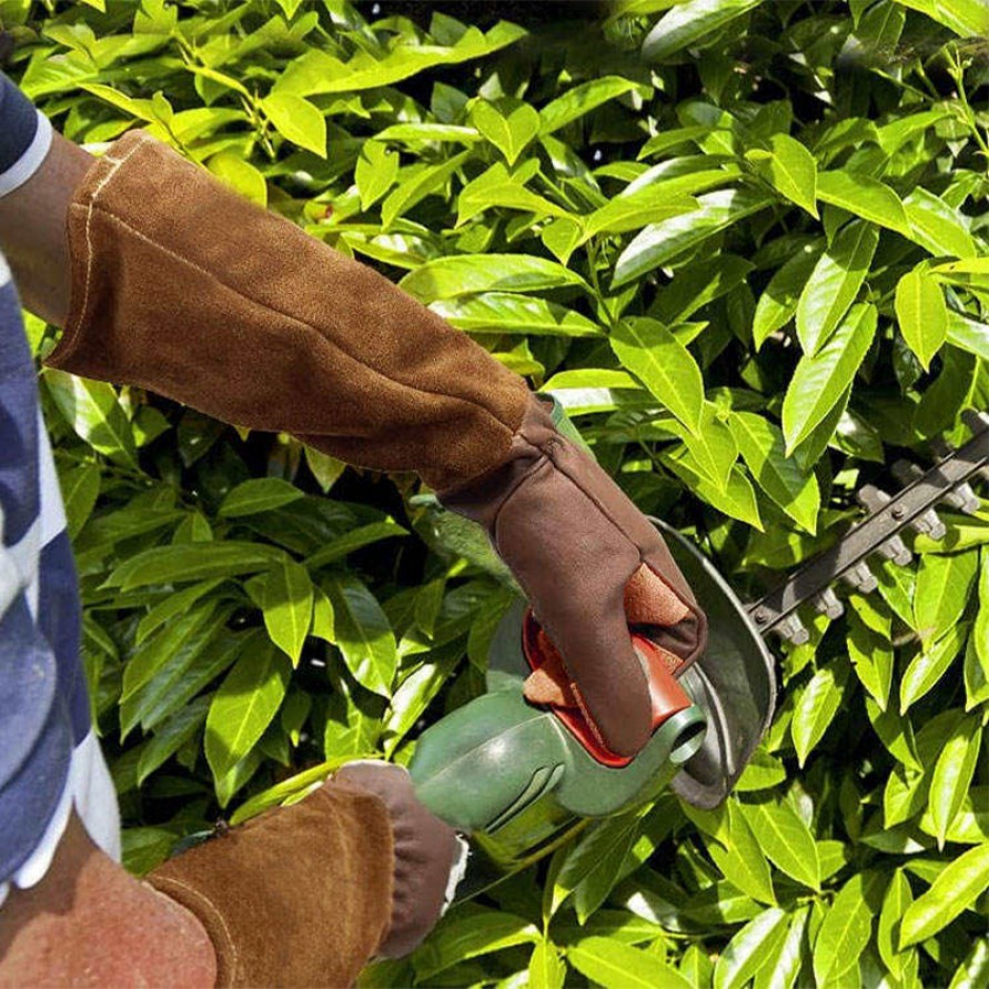 These gardening gloves feature a full-leather design with reinforced palms and fingers, offering excellent puncture resistance and abrasion durability. The medium-length gloves extend over the wrist and forearm for added protection when handling roses, shrubs, and other thorny plants. Their waterproof properties keep hands dry during watering or in damp conditions, while chemical resistance makes them suitable for agriculture, gardening, and floriculture. The supple, textured leather provides a comfortable grip without compromising dexterity.