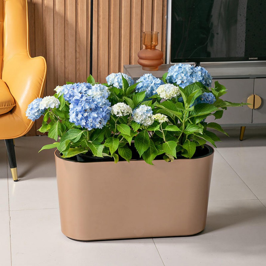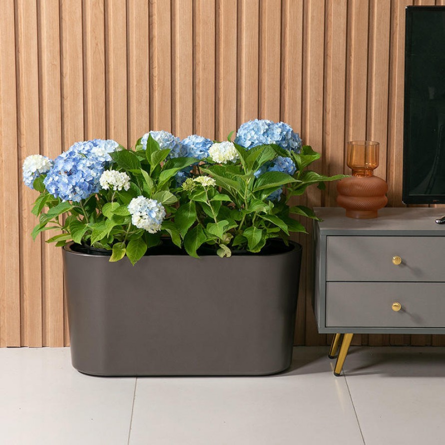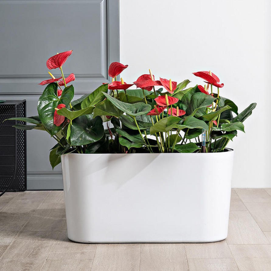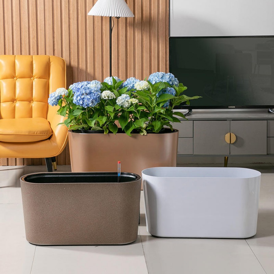 This planter features a modern minimalist design with a bold, stable form, making it ideal for balconies, entryways, living room floors, and hotel common areas. The planter incorporates a self-watering system that slowly supplies plants through a reservoir, effectively conserving water and reducing maintenance effort—perfect for low-maintenance care. Its rectangular shape facilitates spatial planning, allowing neat alignment along walls, walkways, or entrances to enhance order and sophistication in any setting. Suitable for diverse flowers and foliage, it combines practicality with decorative appeal.