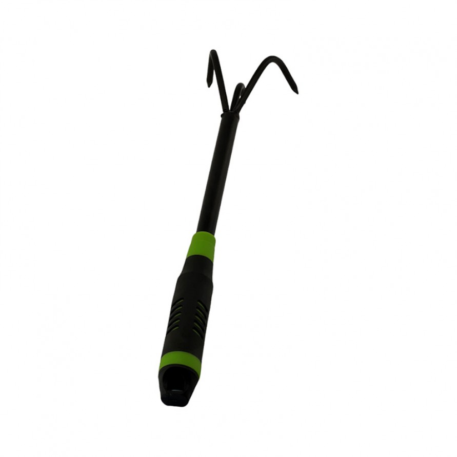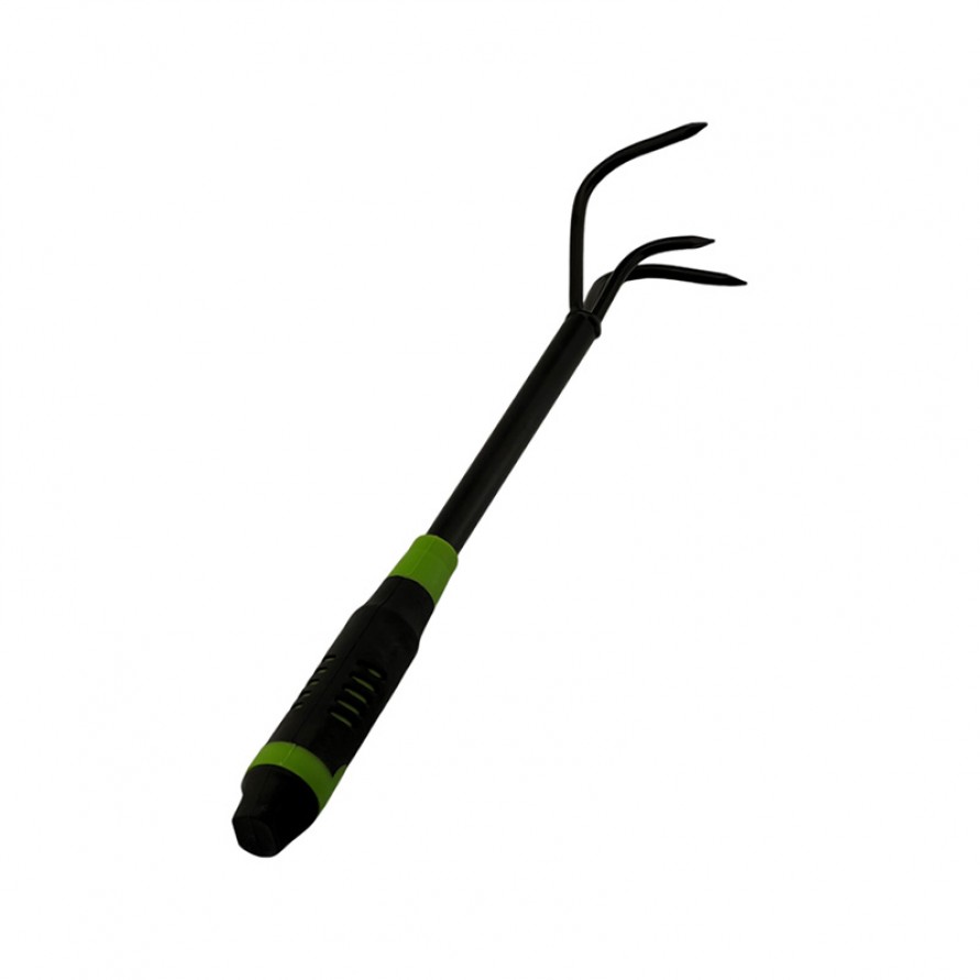 Long-handled three-pronged garden cultivating rake