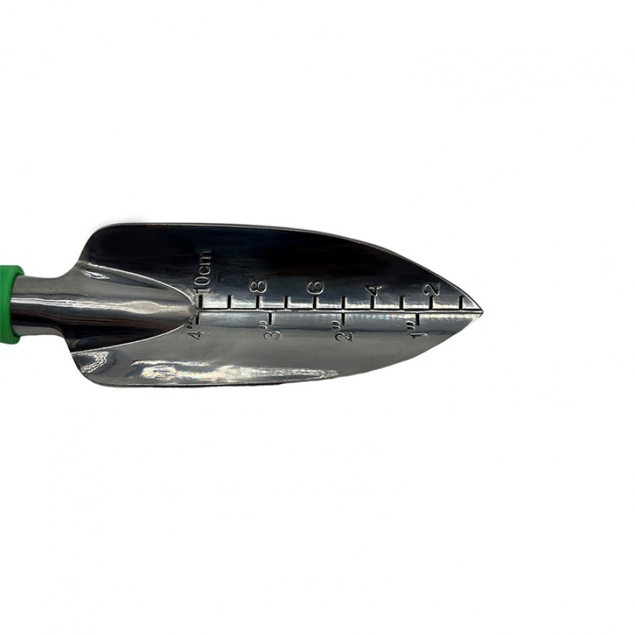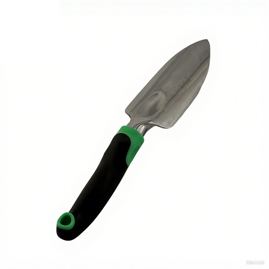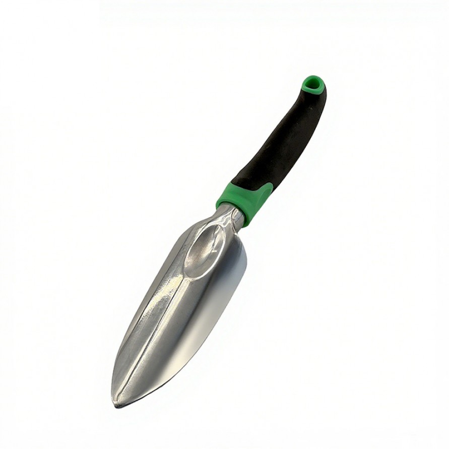 The shovel head is made of aluminum, offering lightweight durability and corrosion resistance. The handle is constructed from sturdy, slip-resistant plastic. After use, promptly clean soil and debris from the shovel head and store it dry to prevent prolonged moisture exposure that could cause oxidation on the aluminum surface. For extended storage, keep the tool in a well-ventilated, dry location to maximize its lifespan.